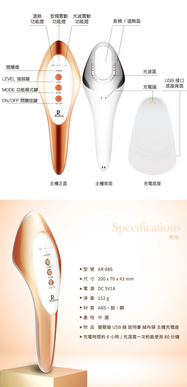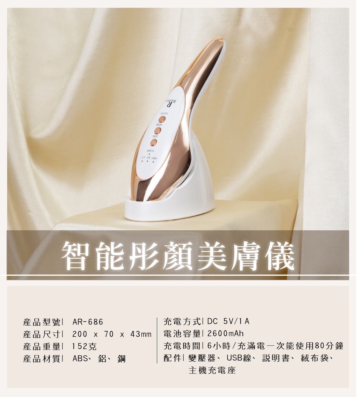 首頁 全部商品 【Runve嫩芙】智能彤顏美膚儀 AR-686 【Runve嫩芙】智能彤顏美膚儀 AR-686NT$7,580 高頻震動 撫平皺紋 三色光波 全能效果 有感溫熱 美麗美肌 光波震動撫紋 解除歲月魔“皺“ 【Runve嫩芙】智能彤顏美膚儀 AR-686 數量 加入購物車 分類: 全部商品, 美容儀器 描述 額外資訊 規格說明 產品名稱:冰熱雙效彤顏儀產品顏色:珍珠白產品尺寸:170 *85*36 mm額定電壓:3.7V使用模式:高頻深層溫熱+紅光+冷敷充電電流:600 mA工作電流:500-2800mARF頻率:1 MHZ製冷溫度:9-12 °C風扇規格:2510/10000 rpm/5 V噪音:10 cm < 50dB電源適配器:5 V/1000 mA 顏色 黑盒金邊-白色, 黑盒銀邊-黑色 相關商品 【Runve嫩芙】奢華美鑽冰肌美容儀 NT$19,000 加入購物車 磁流蝸蝸機 x 還我媽咪彈潤肌 AR-888 NT$4,800 原始價格:NT$4,800。NT$3,280目前價格:NT$3,280。 加入購物車 【Runve嫩芙】鬆鬆肩頸儀 ARBD-001 NT$2,980 原始價格:NT$2,980。NT$1,980目前價格:NT$1,980。 加入購物車 【Runve嫩芙】石墨烯溫感眼罩【ARBD-912】 NT$1,980 原始價格:NT$1,980。NT$1,480目前價格:NT$1,480。 加入購物車