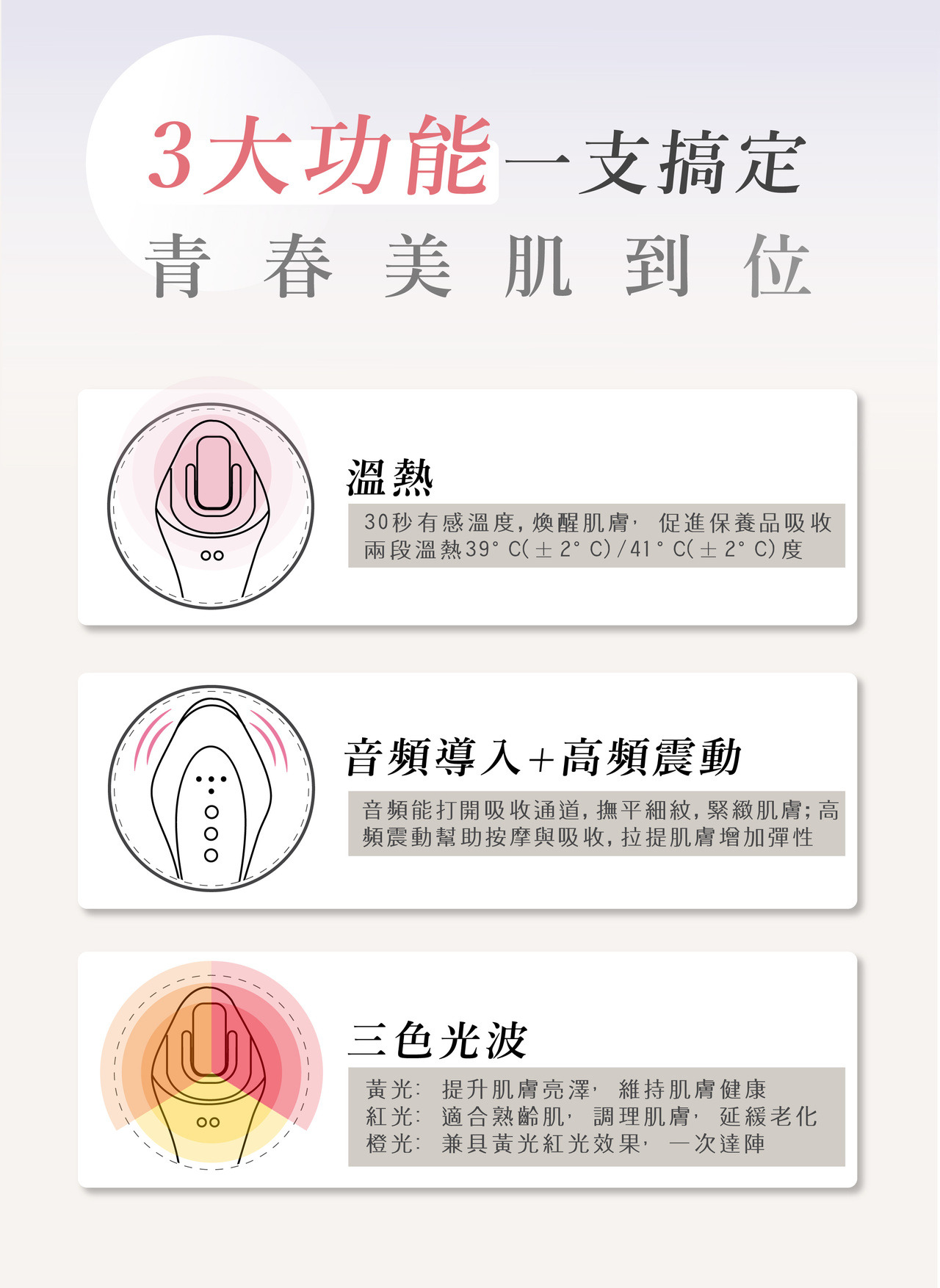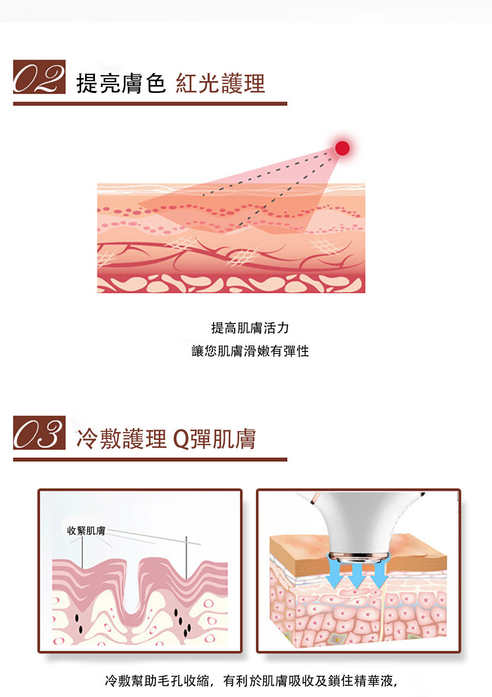 規格說明 產品名稱:冰熱雙效彤顏儀產品顏色:珍珠白產品尺寸:170 *85*36 mm額定電壓:3.7V使用模式:高頻深層溫熱+紅光+冷敷充電電流:600 mA工作電流:500-2800mARF頻率:1 MHZ製冷溫度:9-12 °C風扇規格:2510/10000 rpm/5 V噪音:10 cm < 50dB電源適配器:5 V/1000 mA 顏色 黑盒金邊-白色, 黑盒銀邊-黑色